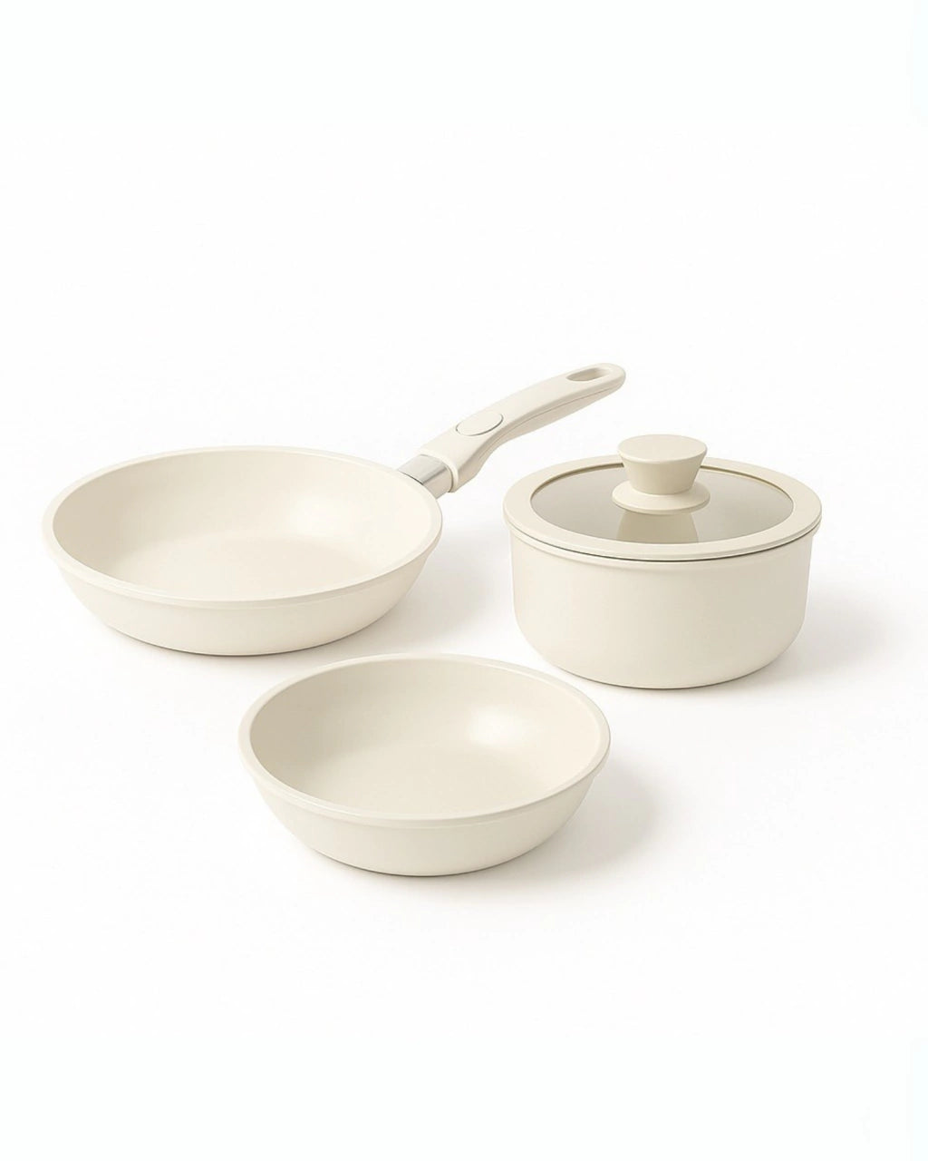 Set de ollas y sartenes con recubrimiento antiadherente. Diseñado para un uso cómodo y funcional.